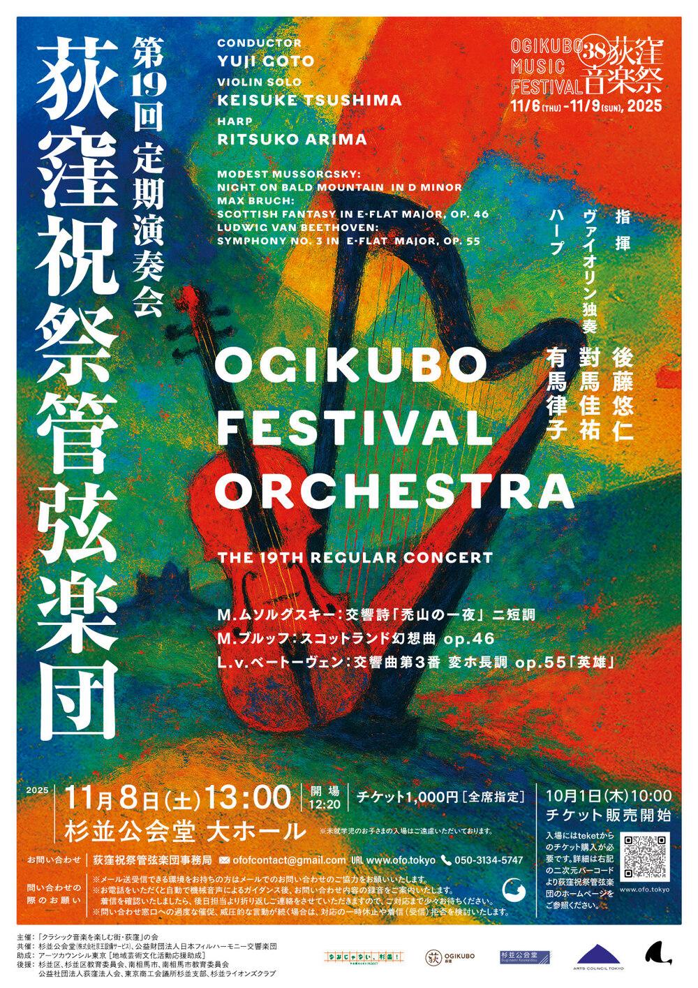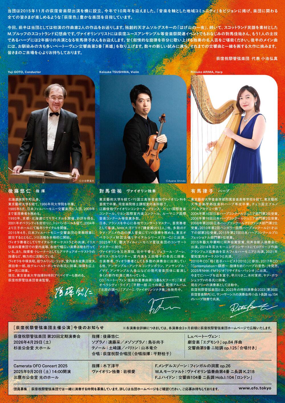 今回、前半は当団としては初演の作曲家2人の作品をお送りします。独創的天才ムソルグスキーの「禿山の一夜」、続いて、スコットランド民謡を素材としたM.ブルッフのスコットランド幻想曲です。ヴァイオリンソリストには荻窪ユースアンサンブル等音楽祭関連イベントでもおなじみの對馬佳祐さん、もう1人の主役であるハープには2年振りの共演となる有馬律子さんをお迎えします。甘く叙情的な旋律を存分に歌い上げる独奏の名人芸をご堪能ください。後半のメイン曲には、お馴染みの方も多いベートーヴェン交響曲第3番「英雄」を取り上げます。数々の新しい試みに満ち、それまでの交響曲と一線を画する大作に挑みます。