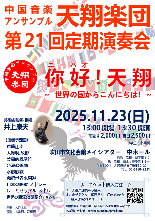 関西万博も開催され、海外からも多くの観光客が関西に訪れています。今年の天翔楽団は、いろいろな国の音楽を楽しんでもらうプログラムにしました。もちろん初めての人にも中国楽器の楽器の魅力を楽しんでもらうために楽器紹介のプログラムも予定しています。