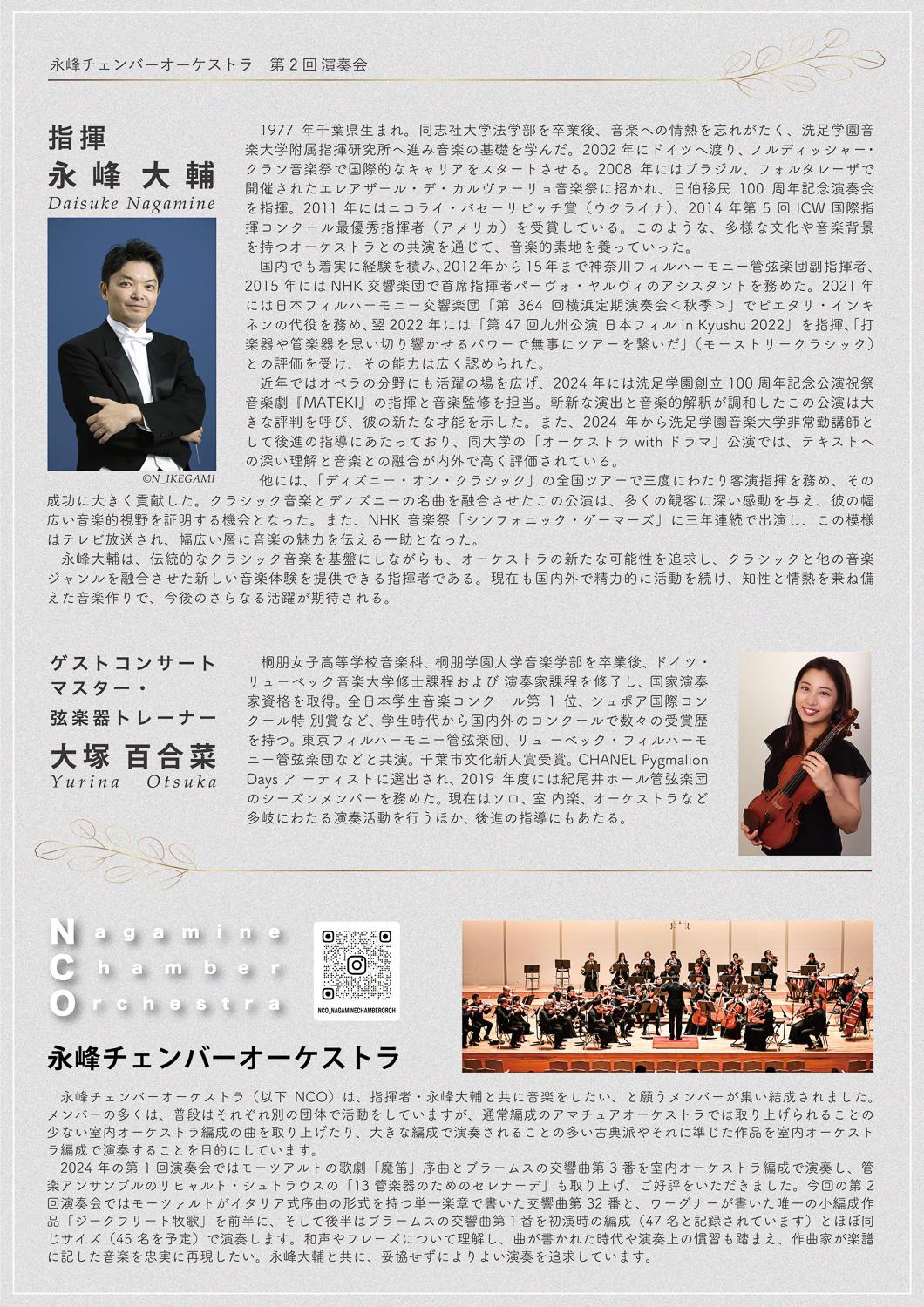 永峰チェンバーオーケストラ(以下NCO)は、指揮者・永峰大輔と共に音楽をしたい、と願うメンバーが集い結成されました。