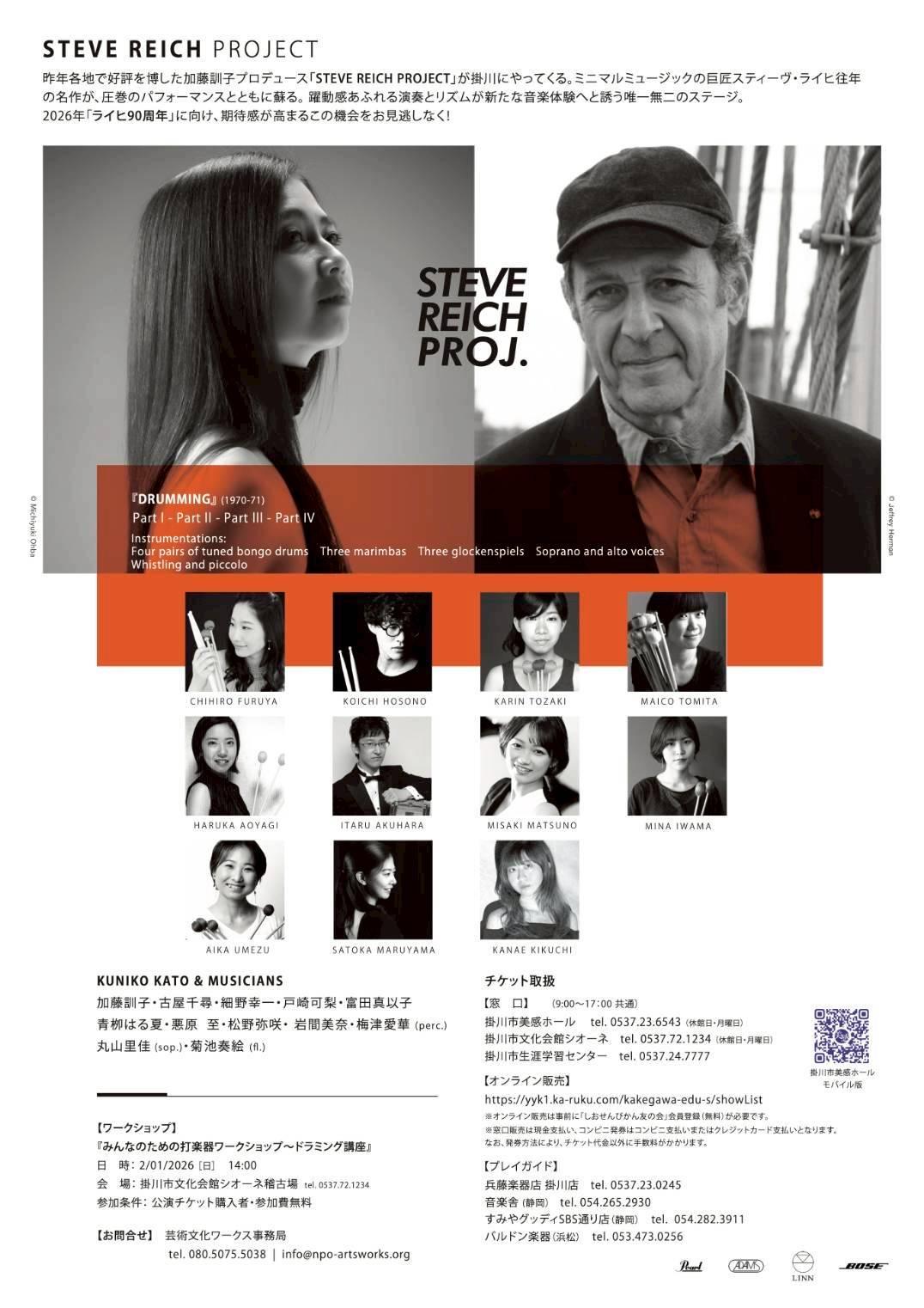 昨年各地で好評を博した加藤訓子プロデュース「STEVE REICH PROJECT」が掛川にやってくる。ミニマルミュージックの巨匠スティーヴ・ライヒ往年の名作が 、圧巻のパ フ ォーマンスとともに蘇る。躍動感あふれる演奏とリズムが、新たな音楽体験へと誘う唯一無二のステージ。