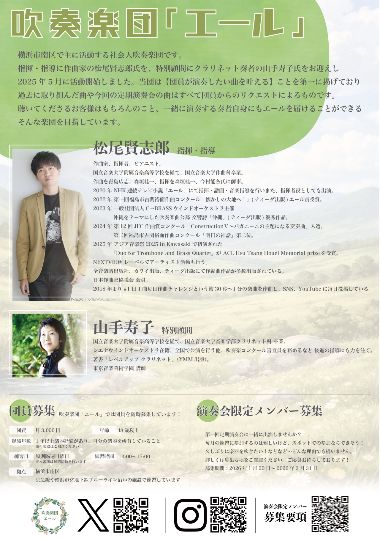 松尾賢志郎(指揮)、山手寿子(クラリネット)、吹奏楽団「エール」