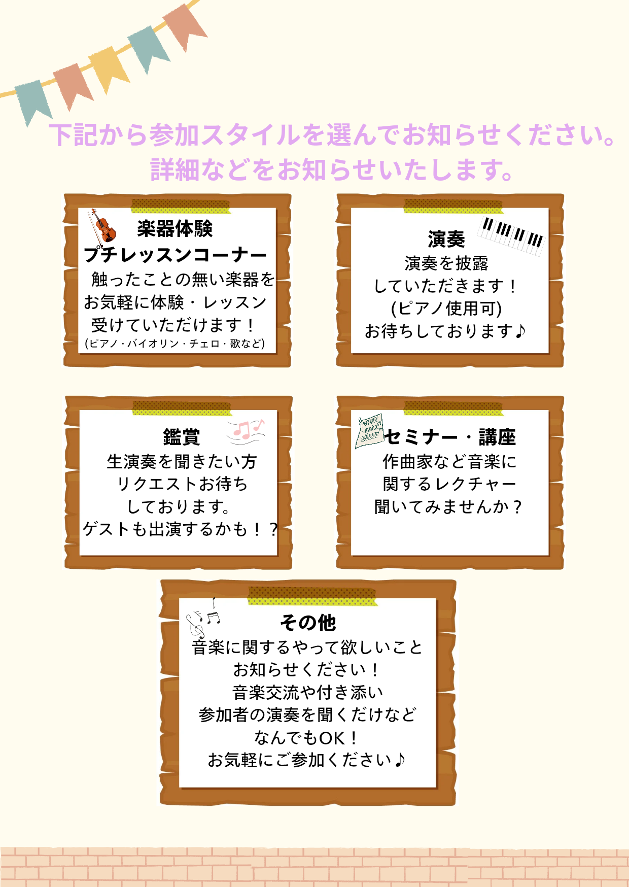 バイオリンなどの楽器体験、演奏発表、音楽仲間との交流、生演奏の鑑賞など、自由にご相談ください。お気軽にご参加ください。