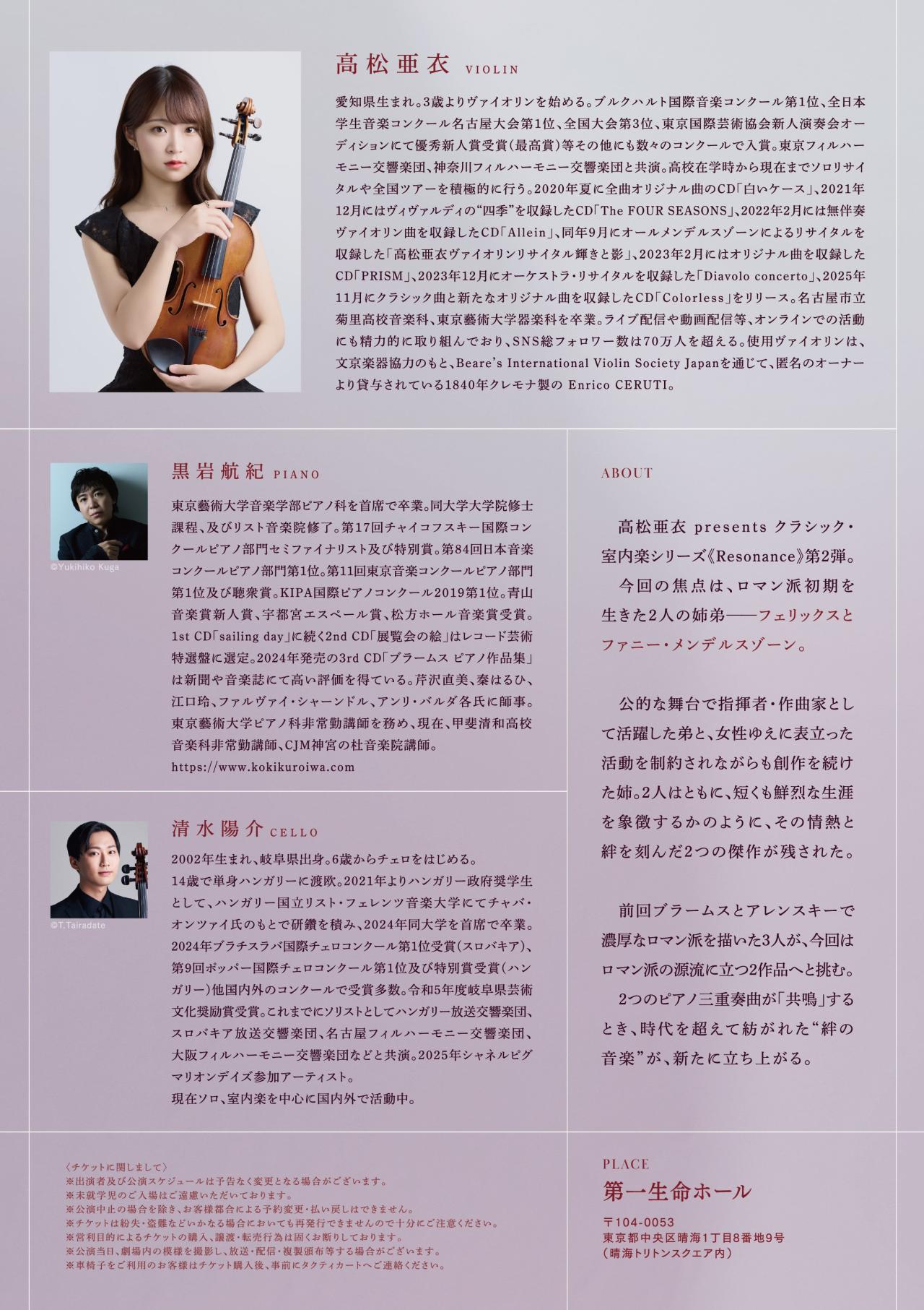 東京藝術大学卒、深い解釈としなやかな音で魅せる実力派ヴァイオリニスト・高松亜衣。オーケストラ共演や全国でのリサイタルを重ねるなかで、“純粋なクラシック作品の魅力をまっすぐに届けたい”という思いから生まれたのが、室内楽シリーズ《Resonance(レゾナンス)》です。
