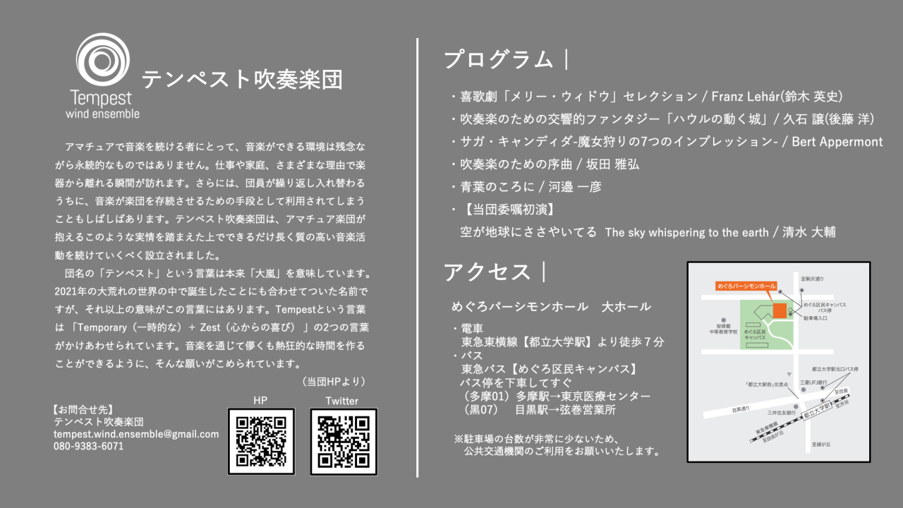 そのほかにも、前半では劇伴音楽を、後半は邦人作品を取り上げております。劇伴音楽はどれも現在のフランス北部を舞台にした作品が集まっております。どれも親しみやすいメロディが曲中にあり、吹奏楽にあまり馴染みのない方にも楽しんでいただけると思います。後半の3作品はどれもキャラクターの違う楽曲なのですが、それぞれ確かに邦人作品らしい緻密な音楽性を内包しています。前半との対比もお楽しみいただけると幸いです。是非ともお越しください!