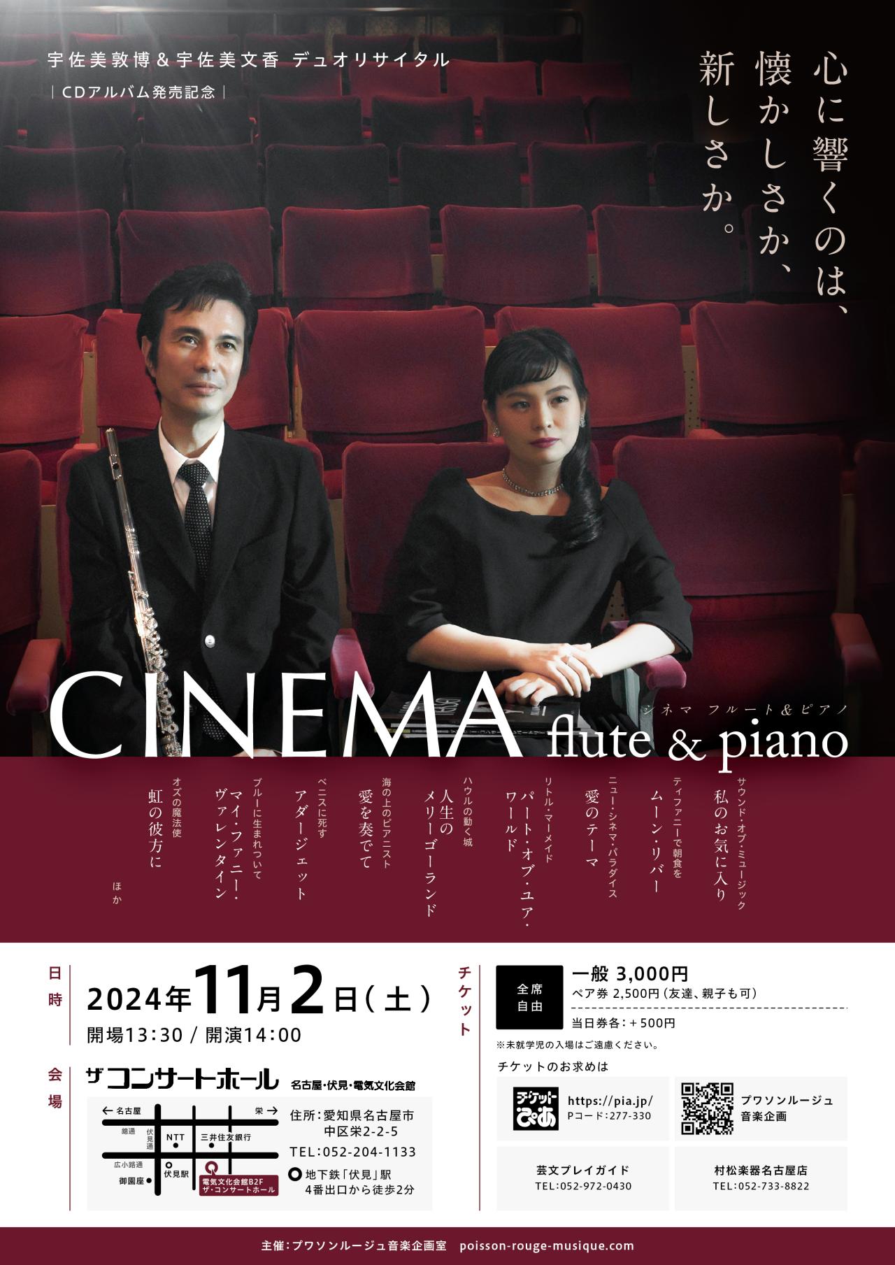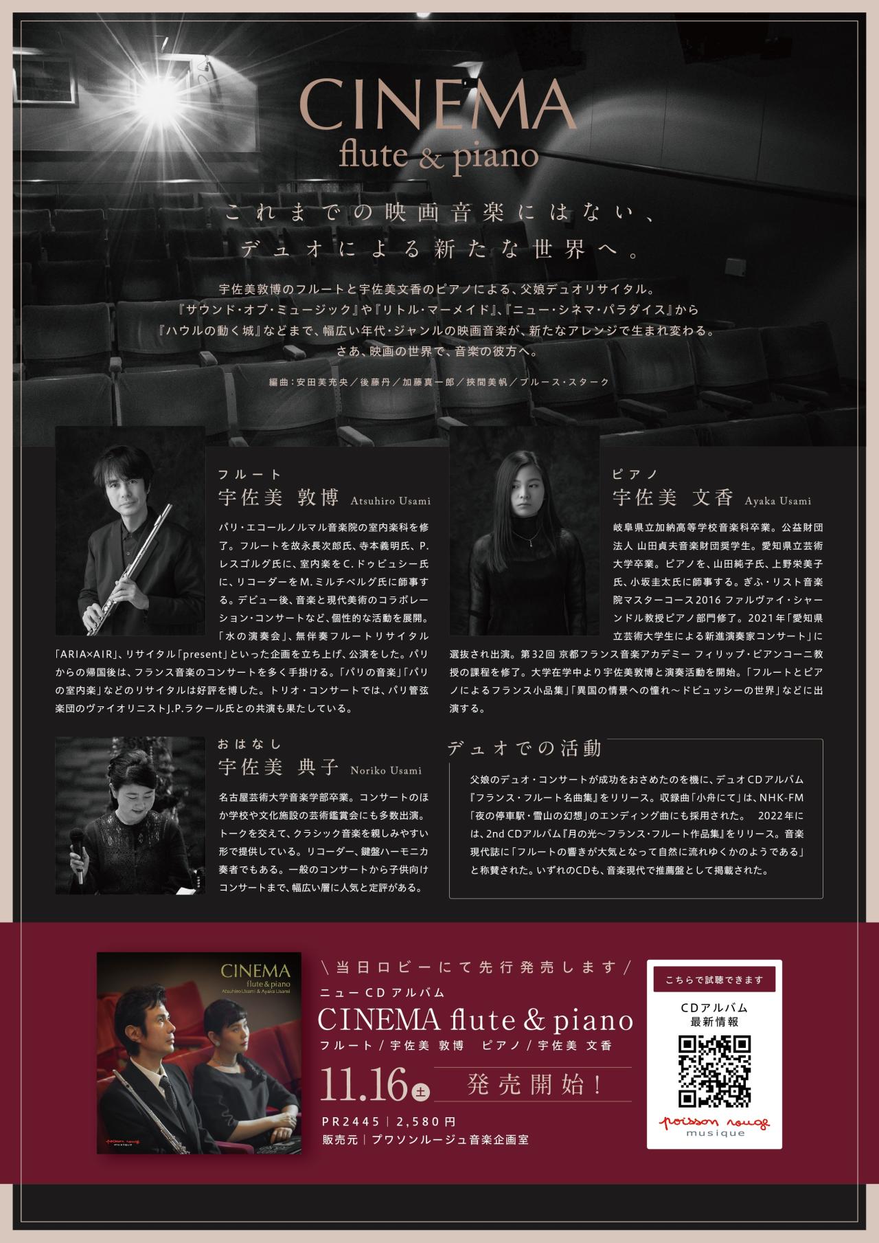 宇佐美敦博のフルートと宇佐美文香のピアノによる、父娘デュオのリサイタル。『サウンド・オブ・ミュージック』や『リトル・マーメイド』、『ニュー・シネマ・パラダイス』から『ハウルの動く城』などまで、幅広い年代・ジャンルの映画音楽が、新たなアレンジで生まれ変わる。さあ、映画の世界で、音楽の彼方へ。