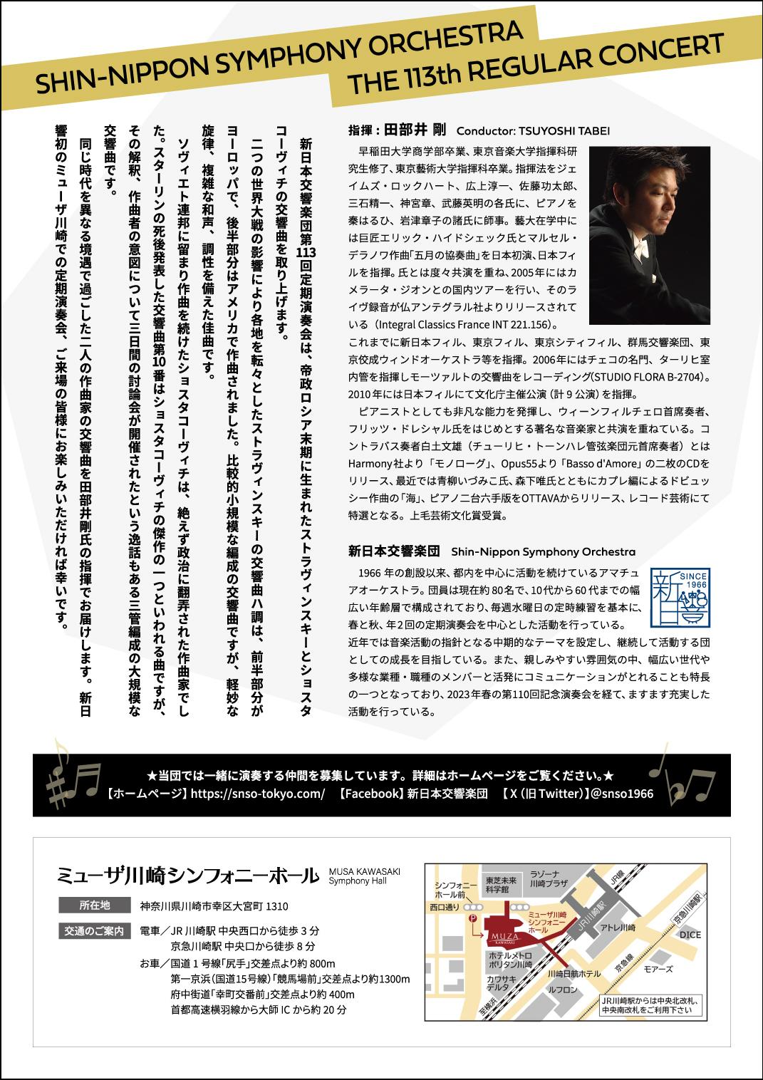 同じ時代を異なる境遇で過ごした二人の作曲家の交響曲を田部井剛氏の指揮でお届けします。新日響初のミューザ川崎での定期演奏会、ご来場の皆様にお楽しみいただければ幸いです。