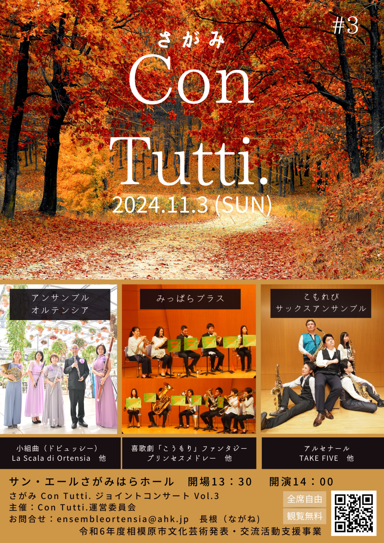 アンサンブル・オルテンシア(木管五重奏)、こもれびサックスアンサンブル、みっぱらブラス(金管アンサンブル)の3団体による合同演奏会。今回で3回目です。