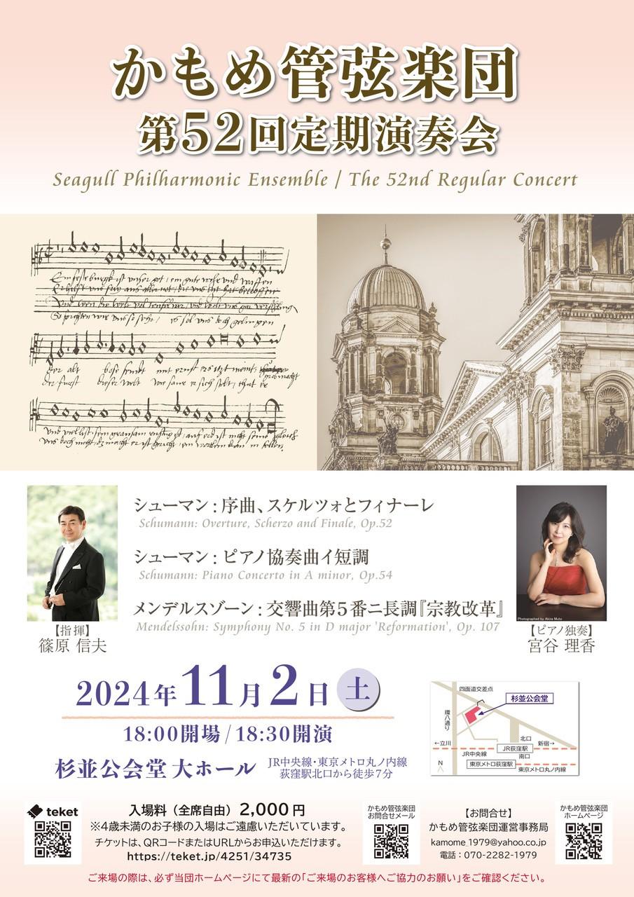 かもめ管弦楽団による第52回定期演奏会は、クラシックファンにはたまらない名曲ぞろいの魅力的なプログラムです。篠原信夫の指揮のもと、シューマンの「序曲、スケルツォとフィナーレ」、ピアノ独奏に宮谷理香を迎え「ピアノ協奏曲 イ短調」、そしてメンデルスゾーンの「交響曲第5番ニ長調『宗教改革』」などの名曲をお楽しみいただけます。当日は心落ち着くひと時をお届けしますので、ぜひご来場ください。