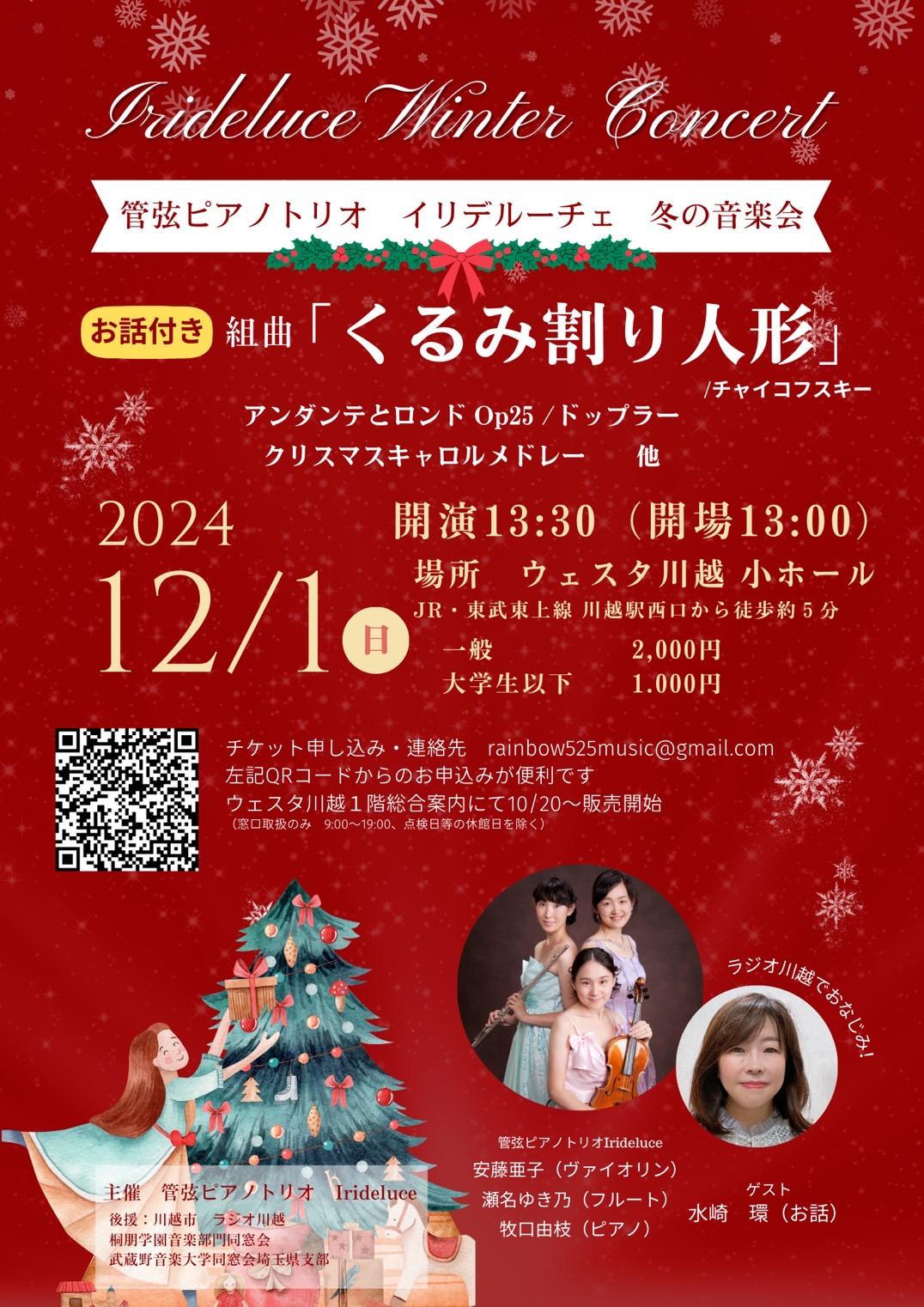 もうすぐクリスマスですね☆イリデルーチェ冬の音楽会では、今回ラジオ川越でおなじみの水崎環さんをお迎えして、チャイコフスキーの「くるみ割り人形」を楽しくお届けします。その他ドップラーの「アンダンテとロンドop25」や「クリスマスメドレー」など盛りだくさん。ぜひ皆さん来てくださいね!