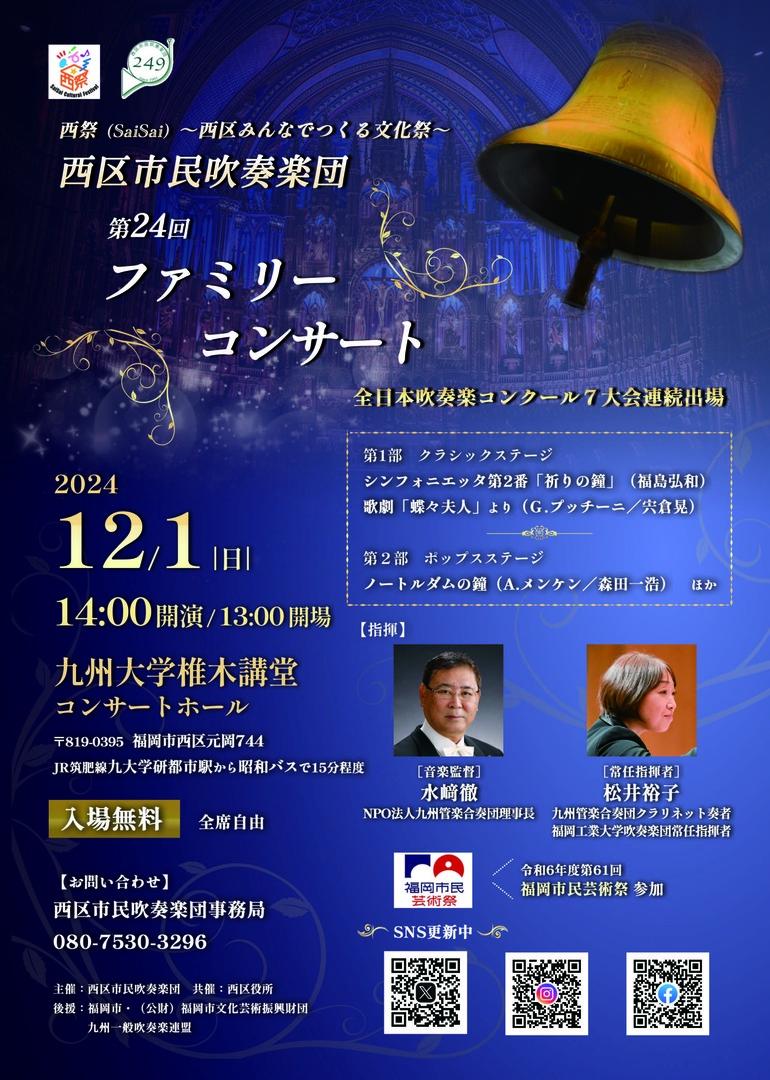全日本吹奏楽コンクール7大会連続出場の「西区市民吹奏楽団」恒例のファミリーコンサートです。毎年春のスプリングコンサート、冬のファミリーコンサートは、共に満席のお客様を迎えて吹奏楽の演奏を楽しんで頂いています。事前申込み不要で、どなたでも無料で参加出来ます。ご家族、ご友人もお誘い合わせの上お出かけください。