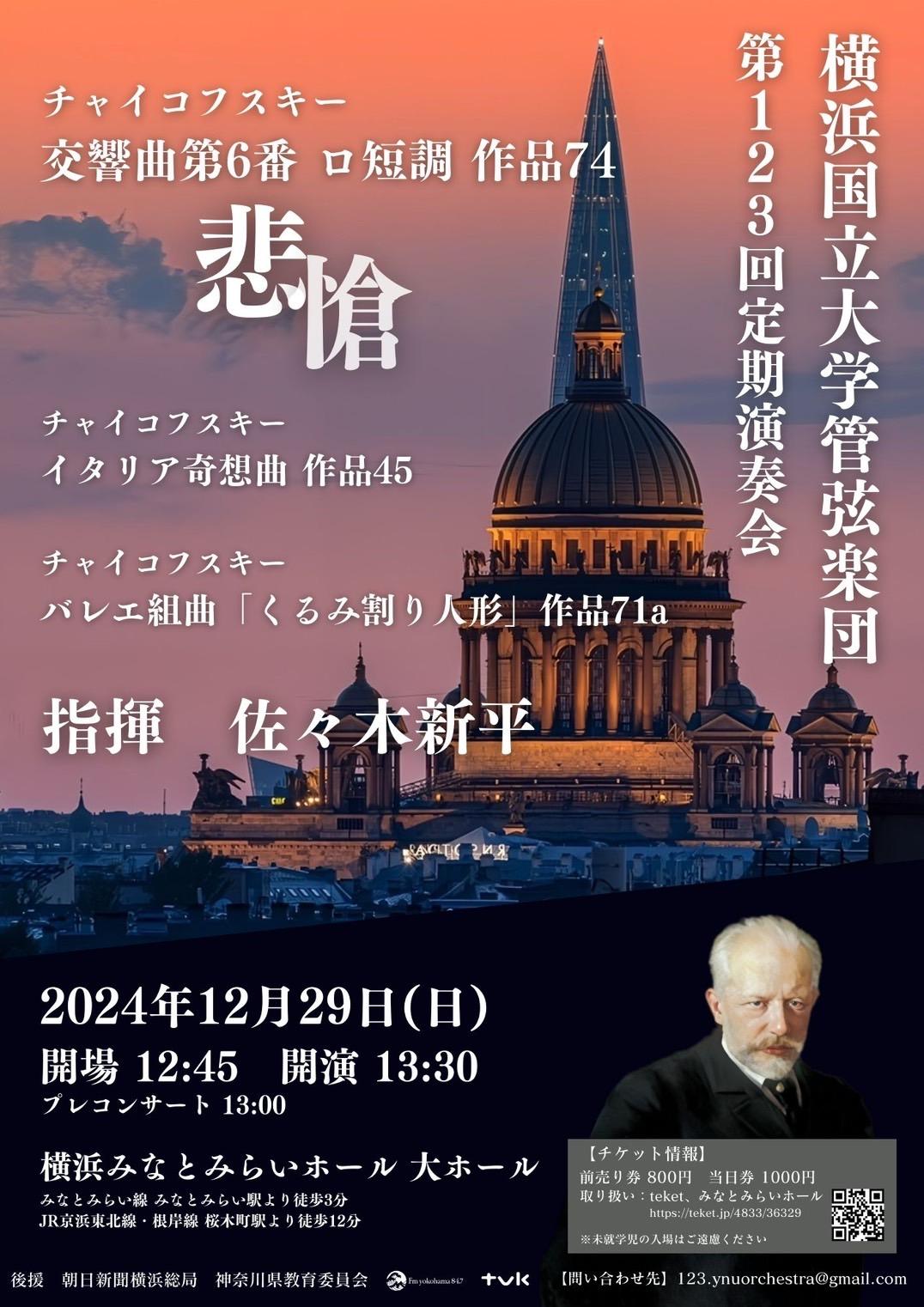 今回は指揮者に佐々木新平先生をお迎えし、オールチャイコフスキーのプログラムでお送りいたします。また、開演前13:00よりプレコンサートとして弦楽四重奏、クラリネット五重奏の演奏も予定しております。