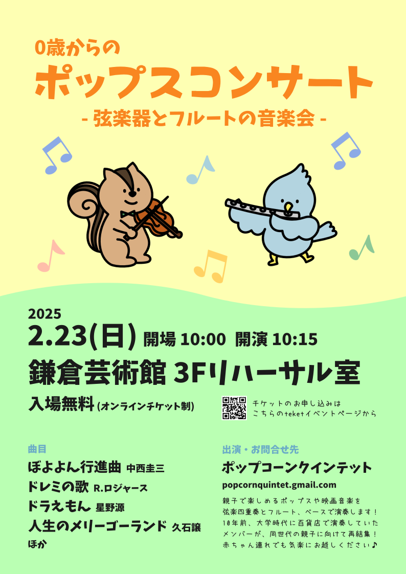 親子で楽しめるポップスや映画音楽を弦楽四重奏とフルート、ベースで演奏します!