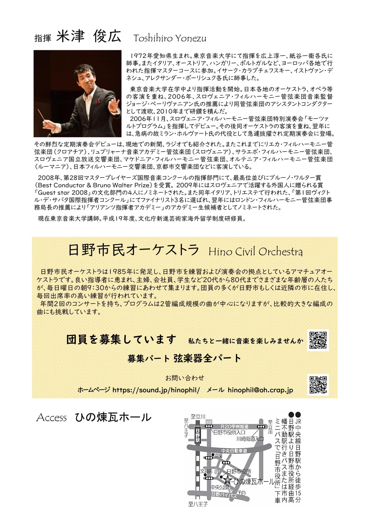 当団は、1985年に発足し、日野市を練習及び演奏会の拠点としているアマチュアオーケストラです。主婦、会社員、学生など20代から80代までさまざまな年齢層の人たちが集まって、毎週日曜日の朝9時30分から練習しています。