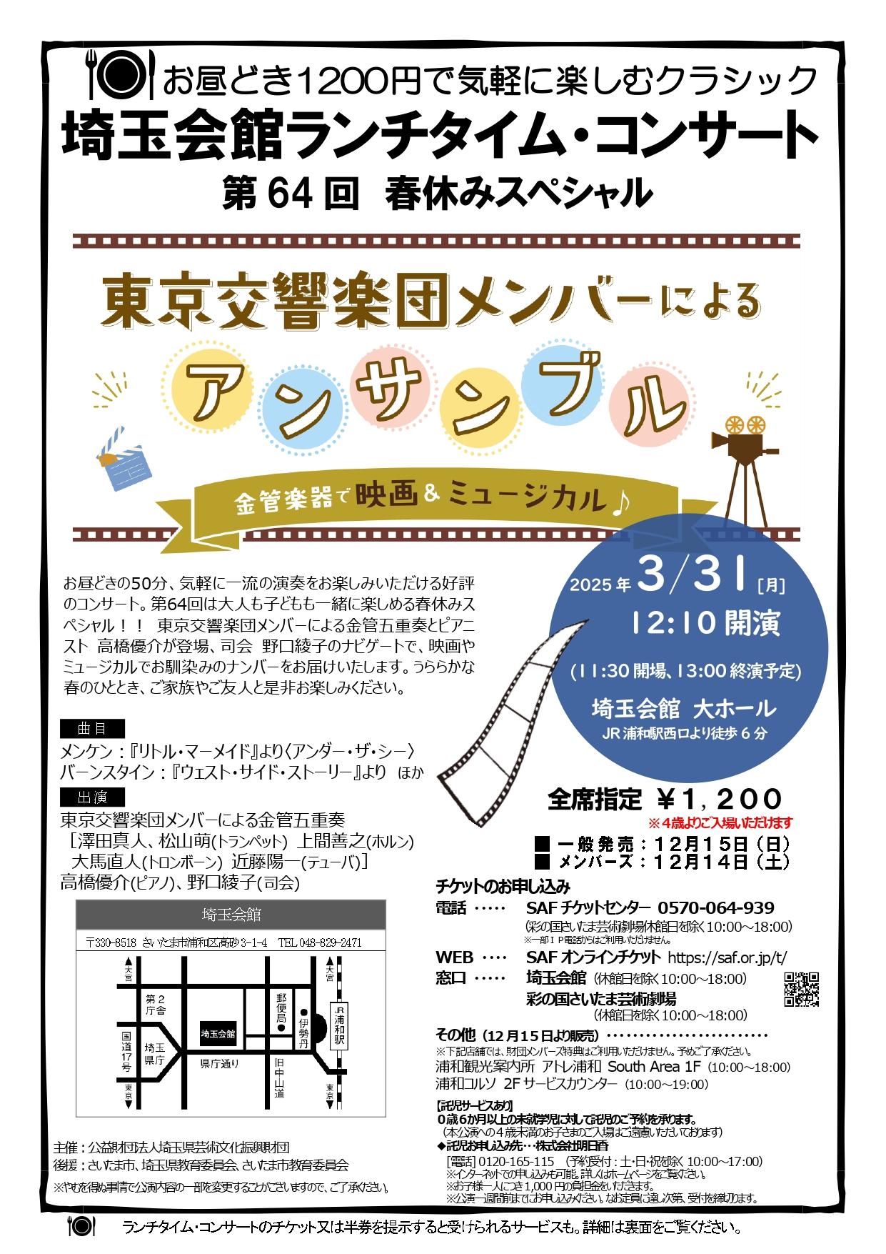 お昼どきの50分、気軽に一流の演奏をお楽しみいただける好評のコンサート。第64回は、4歳から入場可能、ご家族一緒に楽しめる春休みスペシャル!! 東京交響楽団メンバーによる金管五重奏とピアニスト高橋優介が登場、司会 野口綾子のナビゲートで、映画やミュージカルでお馴染みのナンバーをお届けいたします。公演当日、協賛店でチケットを提示すると割引などのサービスを受けられる特典も。うららかな春のひととき、皆さまお誘いあわせの上お出かけください。