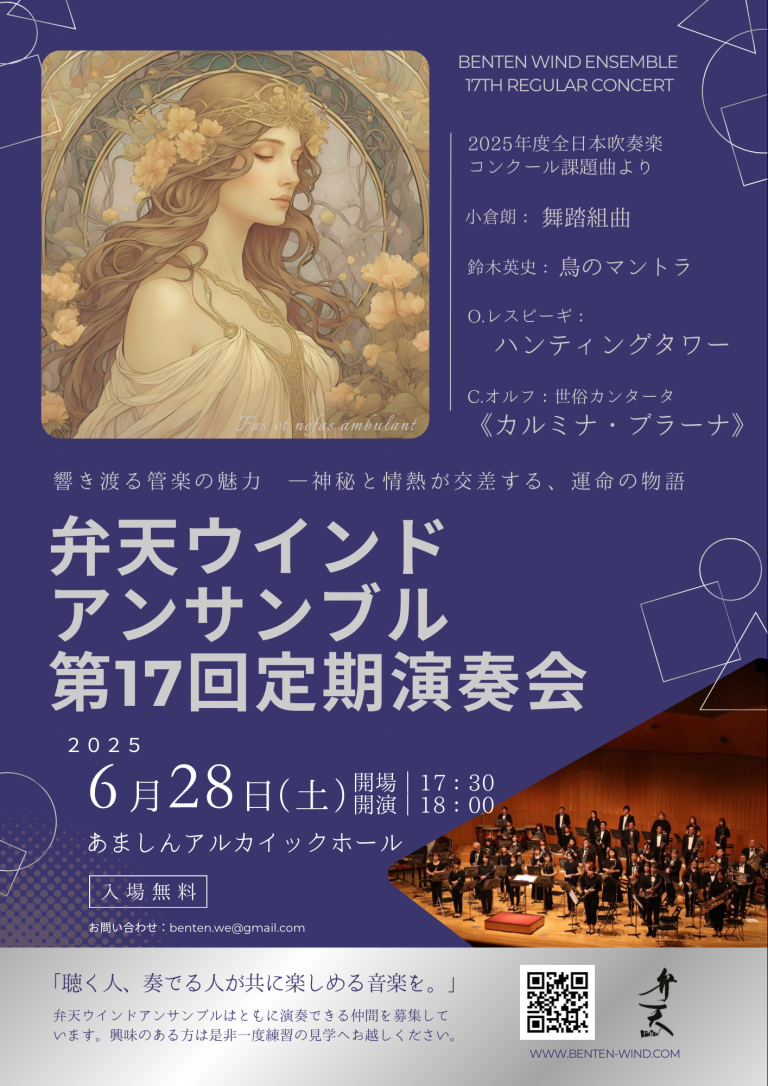 2008年に「聴く人、奏でる人が共に楽しめる音楽を」という合言葉の元に創立され、尼崎・伊丹・西宮を中心に近隣在住のアマチュア演奏家のみで構成された一般の吹奏楽団『弁天ウインドアンサンブル』です。