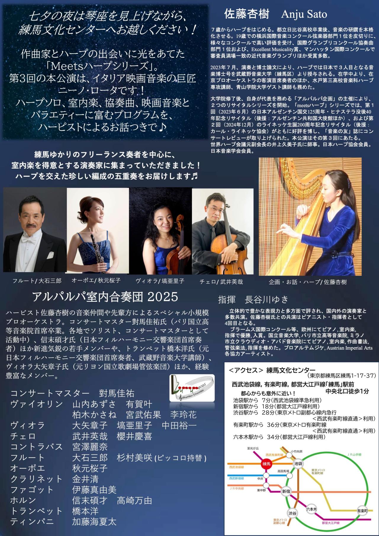 佐藤杏樹ハープ 大石三郎フルート 秋元桜子オーボエ 塙亜里子ヴィオラ 武井英哉チェロ 長谷川ゆき指揮