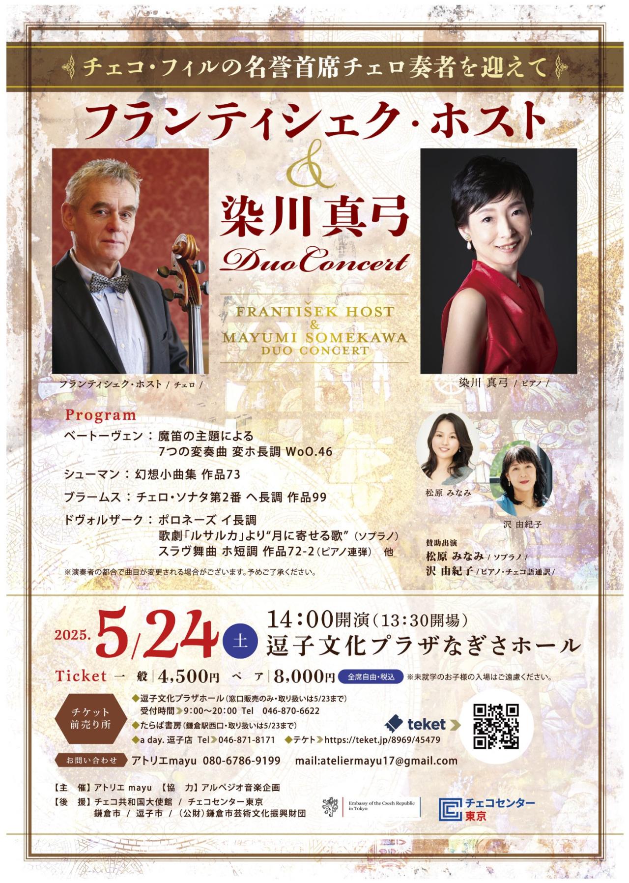 フランティシェク・ホスト氏は1975年にチェコ・フィルハーモニー管弦楽団に入団、首席チェロ奏者兼コンサートマスターを経て現在、名誉首席チェリストを務めており、チェコ・フィルの重鎮的存在です。ホスト氏にとって2025年はチェコ・フィル入団50年目の記念の年でもあります。染川真弓とは2017年の初演以来7回目の共演ですが、賛助出演として松原みなみ(ソプラノ)、沢由紀子(ピアノ・チェコ語通訳)のお二方を迎え盛りだくさんなプログラムにてお送りします。