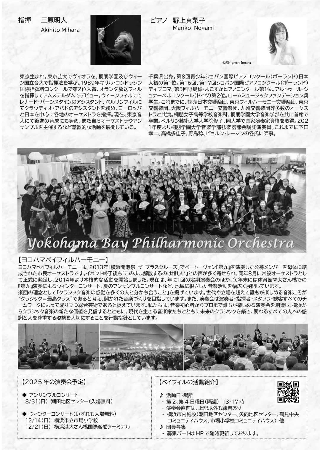 指揮は、数多くのオーケストラやアンサンブルで意欲的な活動を展開している三原明人氏、またベイフィルにとって初となるピアノ協奏曲は、各地で活躍され、今注目を集めるピアニスト・野上真梨子氏をお迎えいたします。