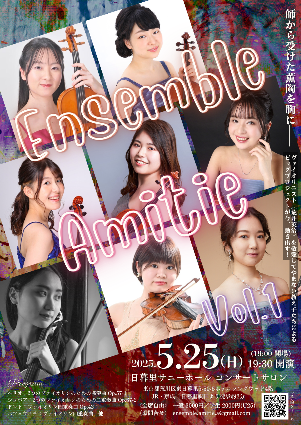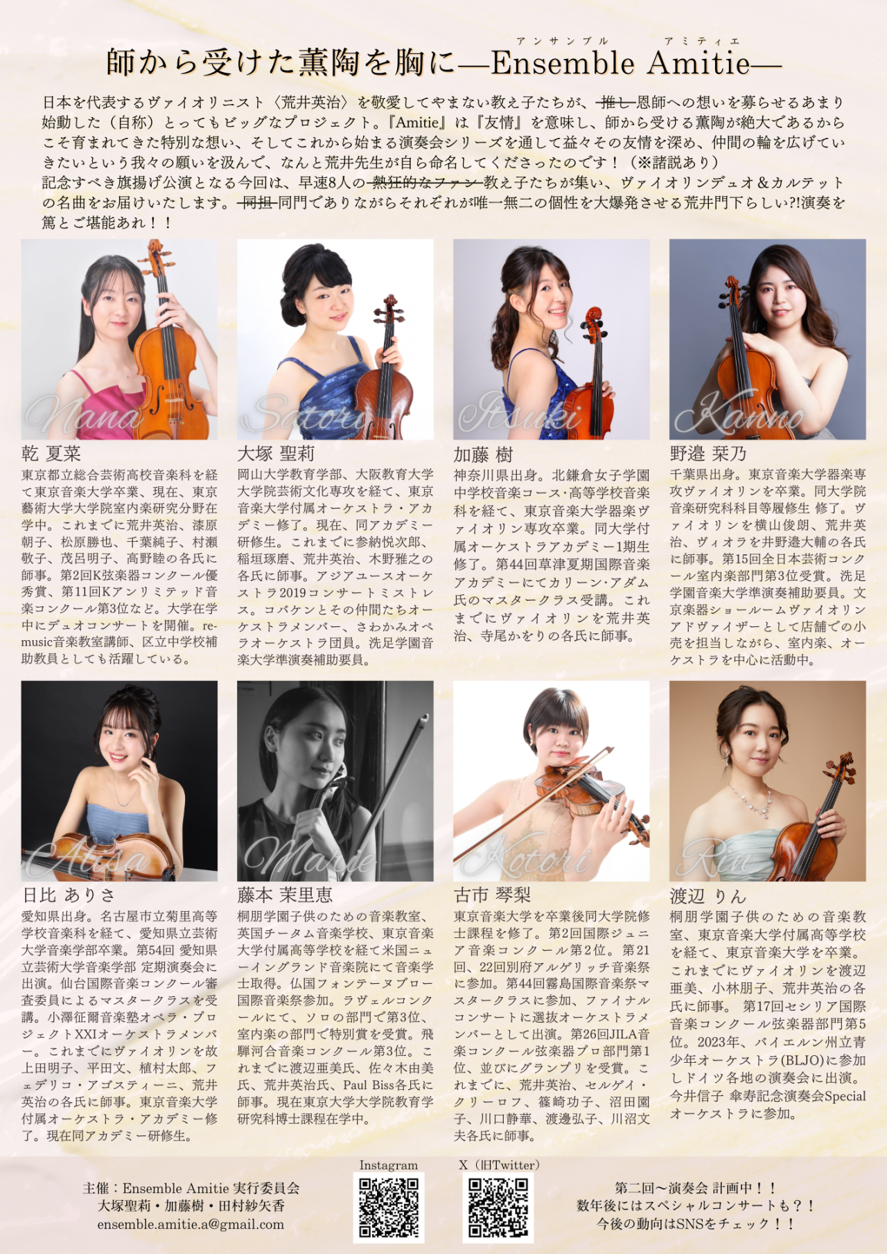 日本を代表するヴァイオリニスト<荒井英治>を敬愛してやまない教え子たちが、恩師への想いを募らせるあまり始動した(自称)とってもビッグなプロジェクト。『Amitie』は『友情』を意味し、師から受ける薫陶が絶大であるからこそ育まれてきた特別な想い、そしてこれから始まる演奏会シリーズを通して益々その友情を深め、仲間の輪を広げていきたいという我々の願いを汲んで、なんと荒井先生が自ら命名してくださったのです!(※諸説あり)