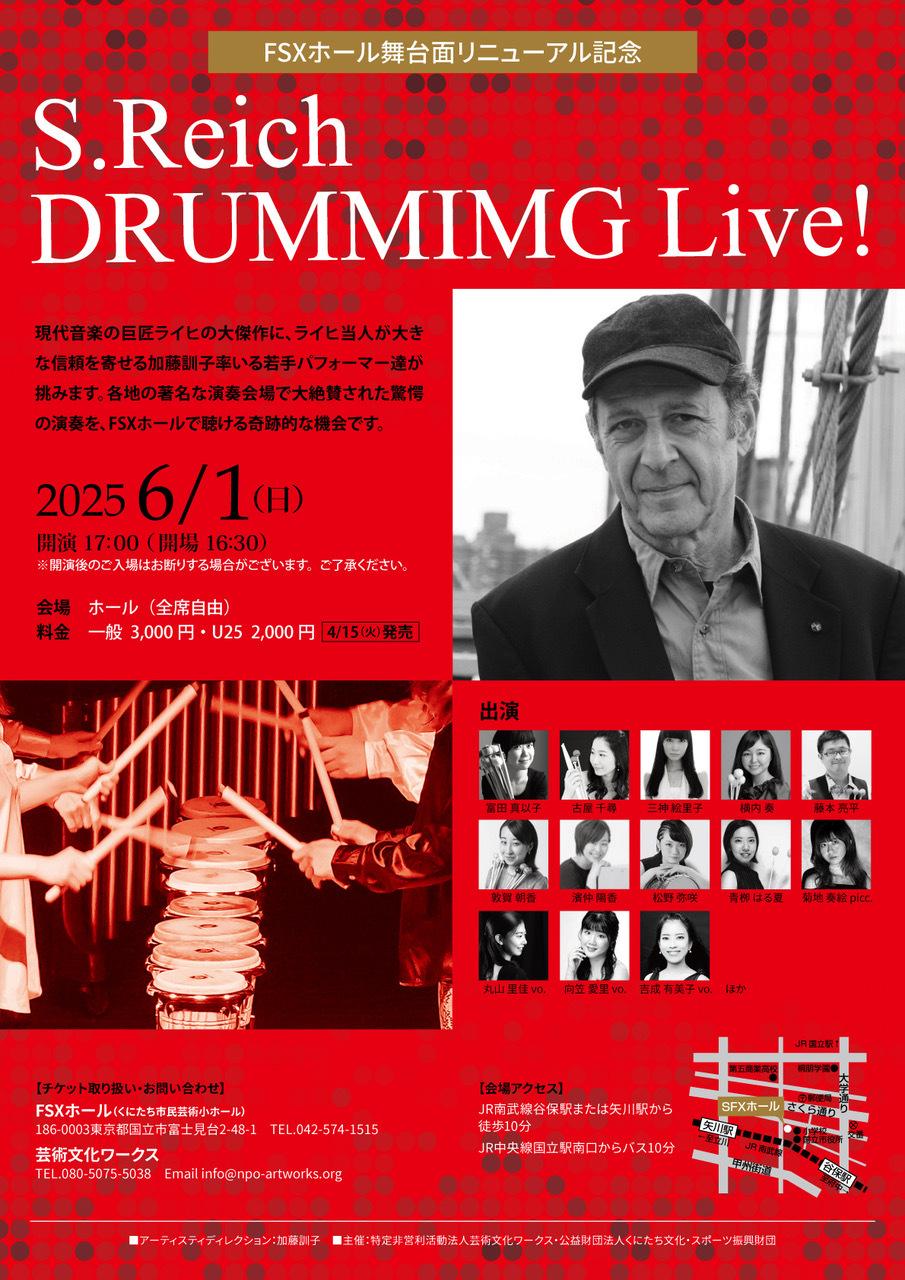 加藤訓子が若手演奏家支援プログラム「inc.」Special Concert として、FSXホール(くにたち市民芸術小ホール)リニューアルを記念して贈るスティーヴ・ライヒの『ドラミング』LIVE (全楽章)