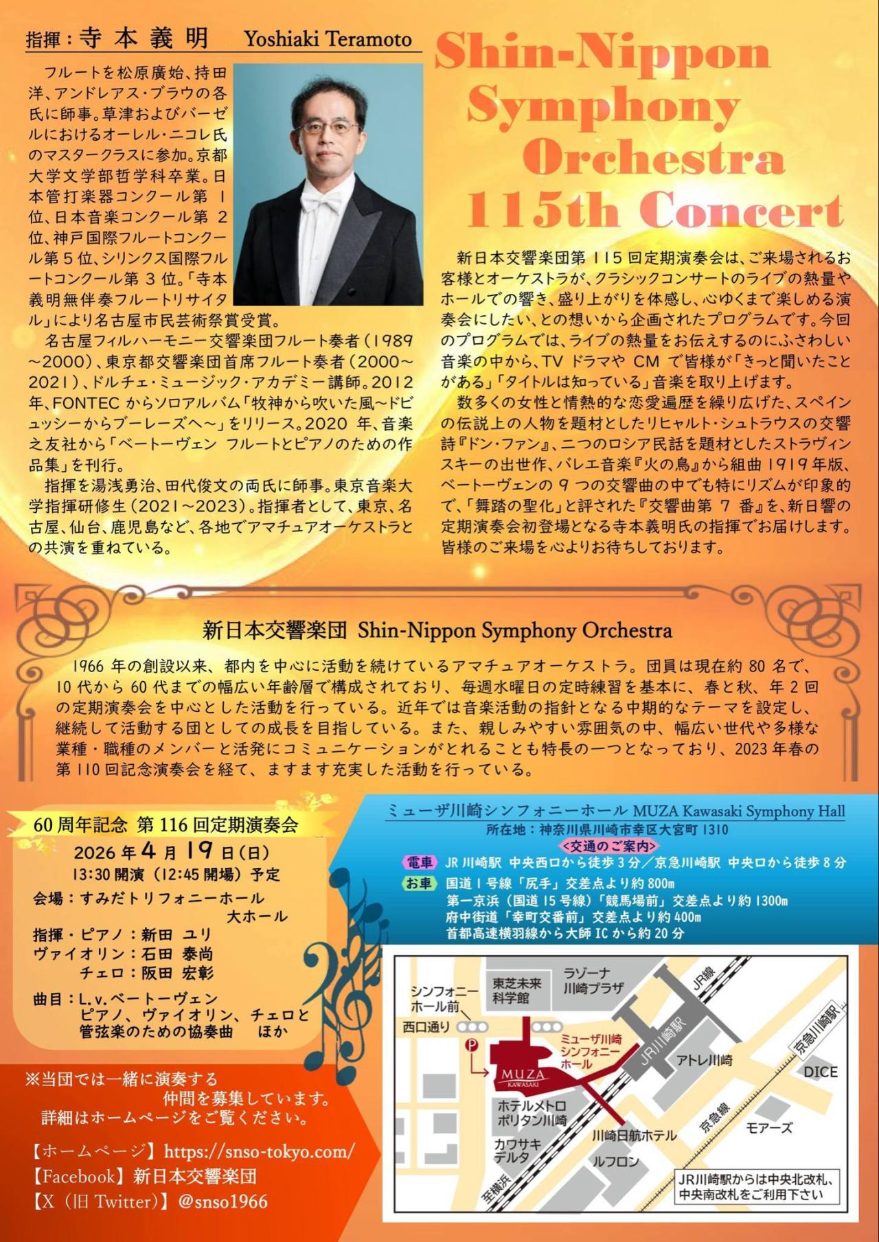 数多くの女性と情熱的な恋愛遍歴を繰り広げた、スペインの伝説上の人物を題材としたリヒャルト・シュトラウスの交響詩『ドン・ファン』、二つのロシア民話を題材としたストラヴィンスキーの出世作、バレエ音楽『火の鳥』から組曲1919年版、ベートーヴェンの9つの交響曲の中でも特にリズムが印象的で、「舞踏の聖化」と評された『交響曲第7番』を、新日響の定期演奏会初登場となる寺本義明氏の指揮でお届けします。皆様のご来場を心よりお待ちしております。