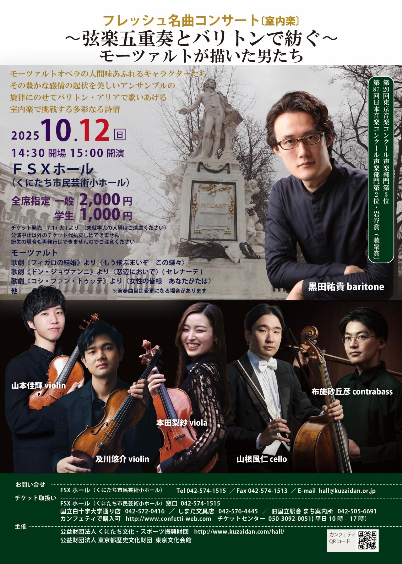 公益財団法人くにたち文化・スポーツ振興財団FSXホール(くにたち市民芸術小ホール)と公益財団法人東京都歴史文化財団 東京文化会館との共同主催でお贈りするフレッシュ名曲コンサート(室内楽)~弦楽五重奏とバリトンで紡ぐ~モーツァルトが描いた男たち。東京音楽コンクール入賞者である新進気鋭の音楽家が出演する公演をお楽しみください。