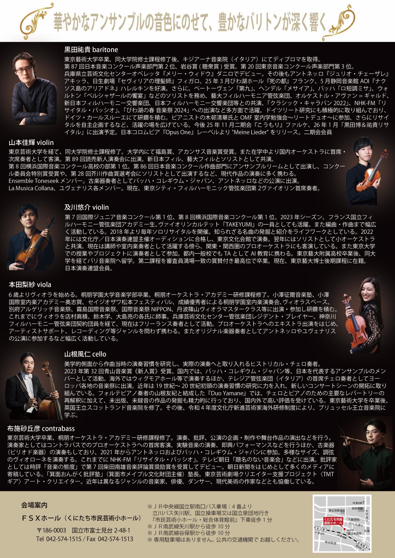 黒田 祐貴(バリトン)、山本 佳輝(ヴァイオリン)、及川 悠介(ヴァイオリン)、本田 梨紗(ヴィオラ)、山根 風仁(チェロ)、布施 砂丘彦(コントラバス)