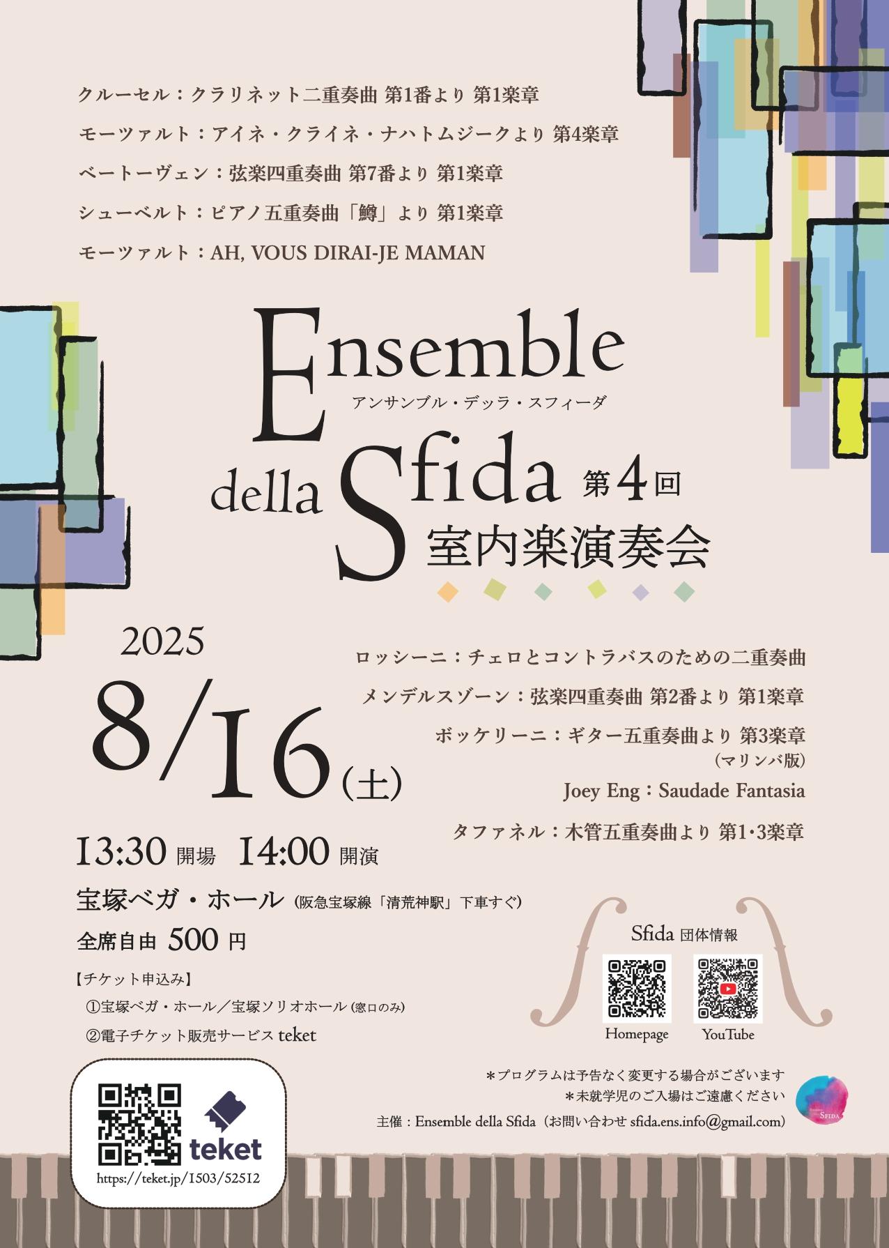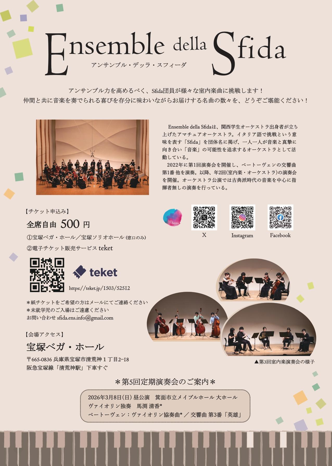 アンサンブル力を高めるべく、Sfida団員が様々な室内楽曲に挑戦します!仲間と共に音楽を奏でられる喜びを存分に味わいながらお届けする名曲の数々を、どうぞご堪能ください!