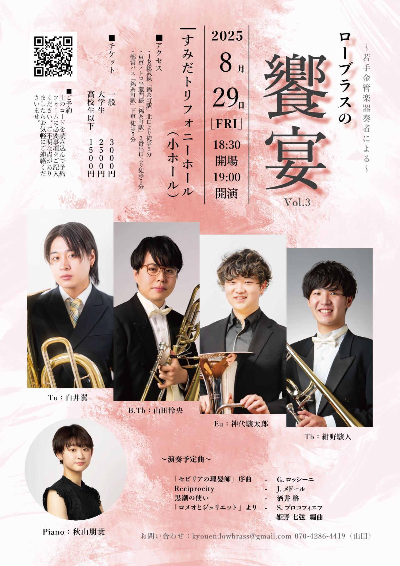 若手ながら国内外で活躍する低音金管楽器奏者による室内楽のコンサートです。