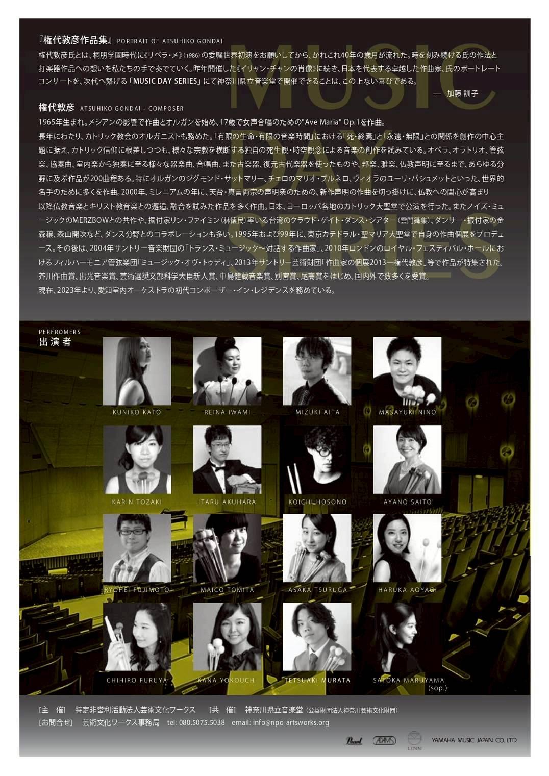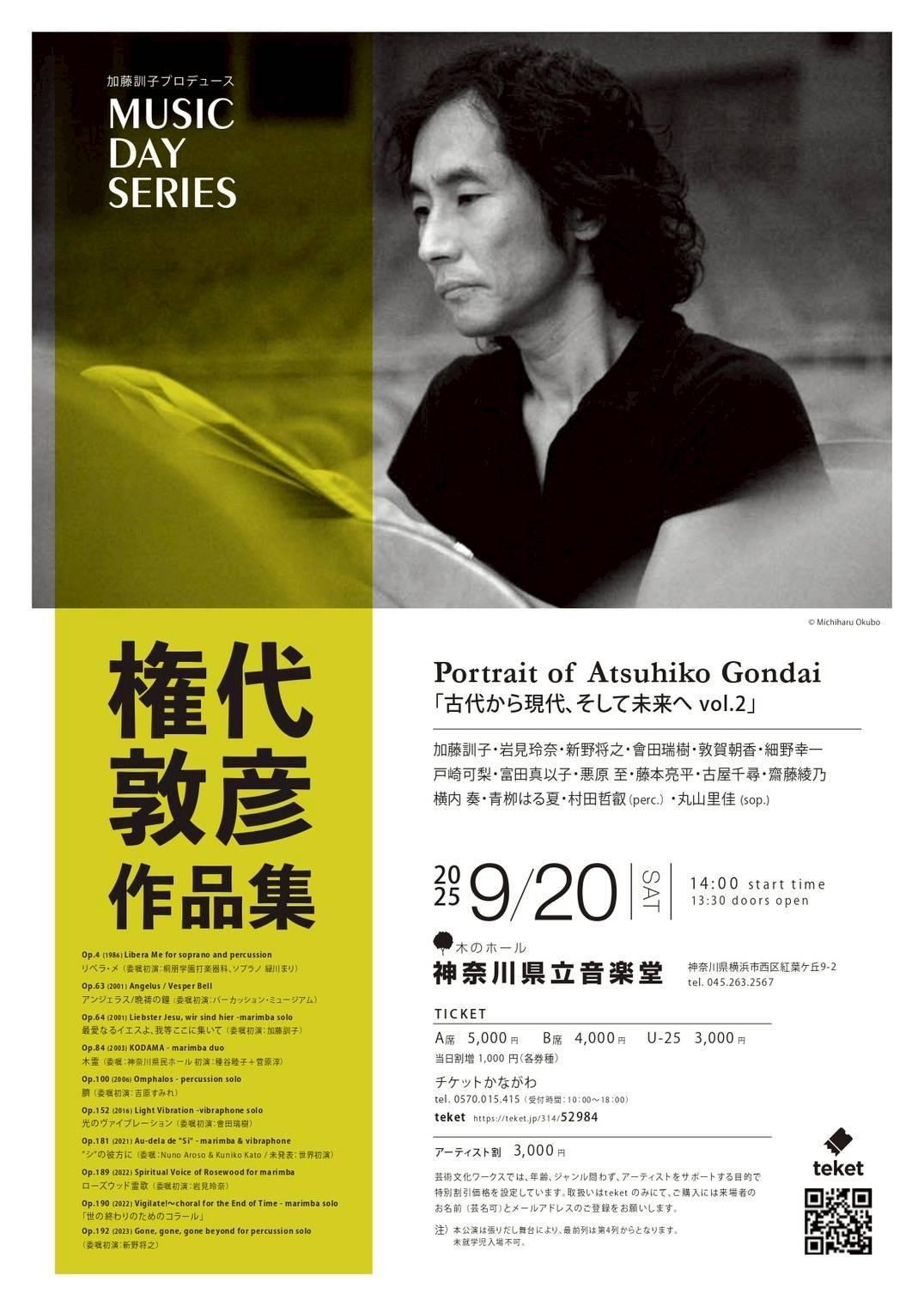 権代敦彦氏とは、桐朋学園時代に《リベラ・メ》(1986)の委嘱世界初演をお願いしてから、かれこれ40年の歳月が流れた。時を刻み続ける氏の作法と打楽器作品への想いを私たちの手で奏でていく。昨年開催した《イリャン・チャンの肖像》に続き、日本を代表する作曲家、権代敦彦氏のポートレートコンサートを、次代へ繋げる 「MUSIC DAY SERIES」 にて神奈川県立音楽堂で開催できることは、この上ない喜びである。 加藤訓子