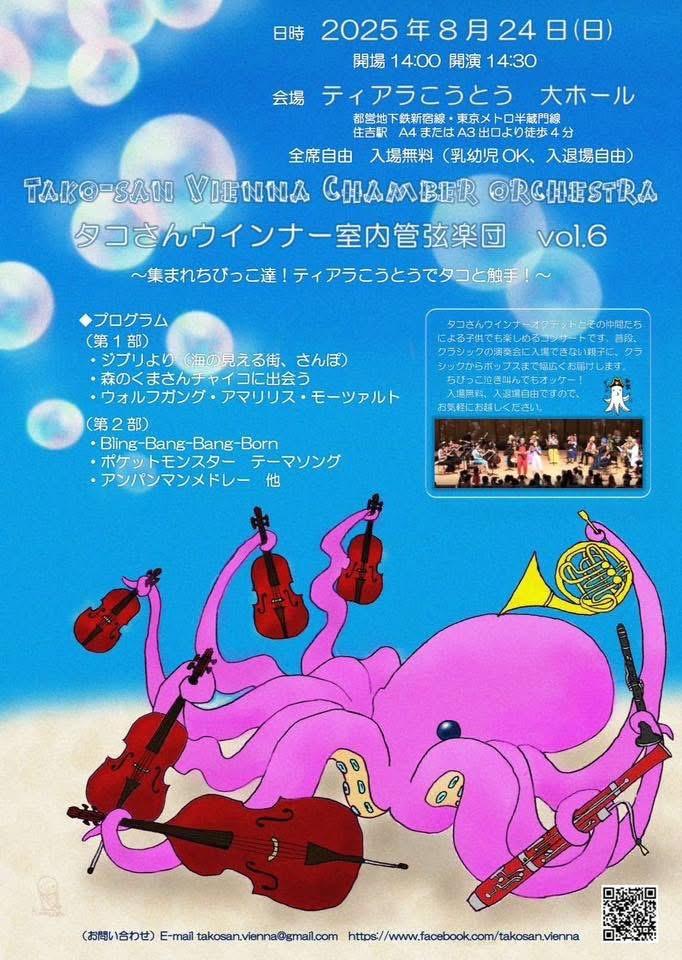 タコさんウインナーオクテットとその仲間たちによる子供でも楽しめるコンサートです。普段、クラシックの演奏会に入場できない親子に、クラシックからポップスまで幅広くお届けします。