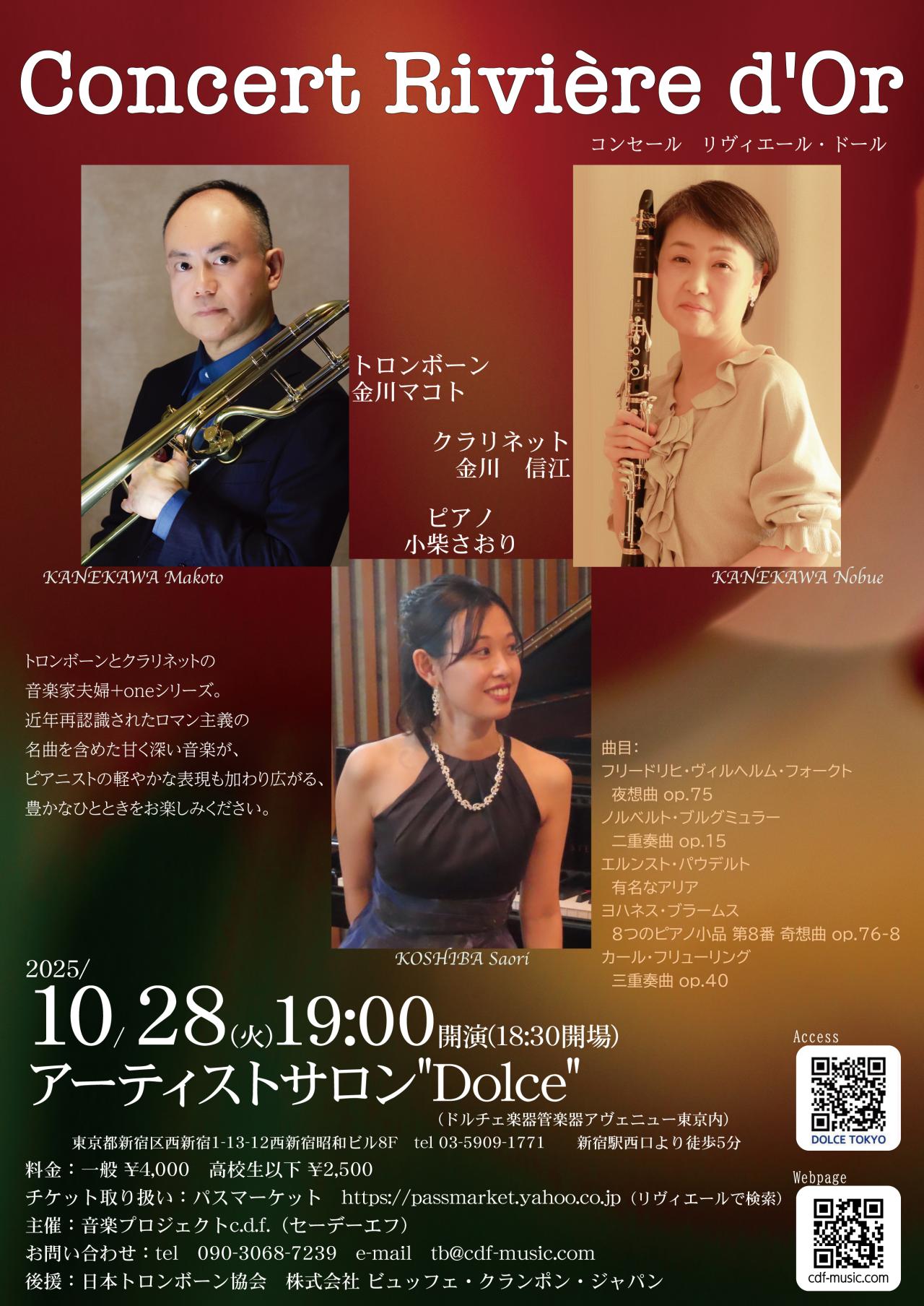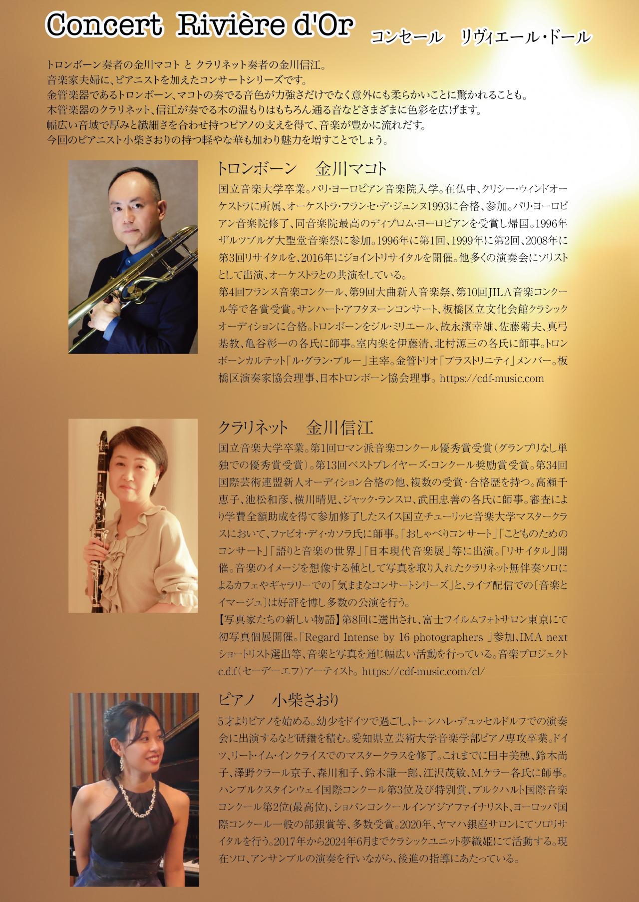 トロンボーン奏者の金川マコト と クラリネット奏者の金川信江。音楽家夫婦に、ピアニストを加えたコンサートシリーズです。