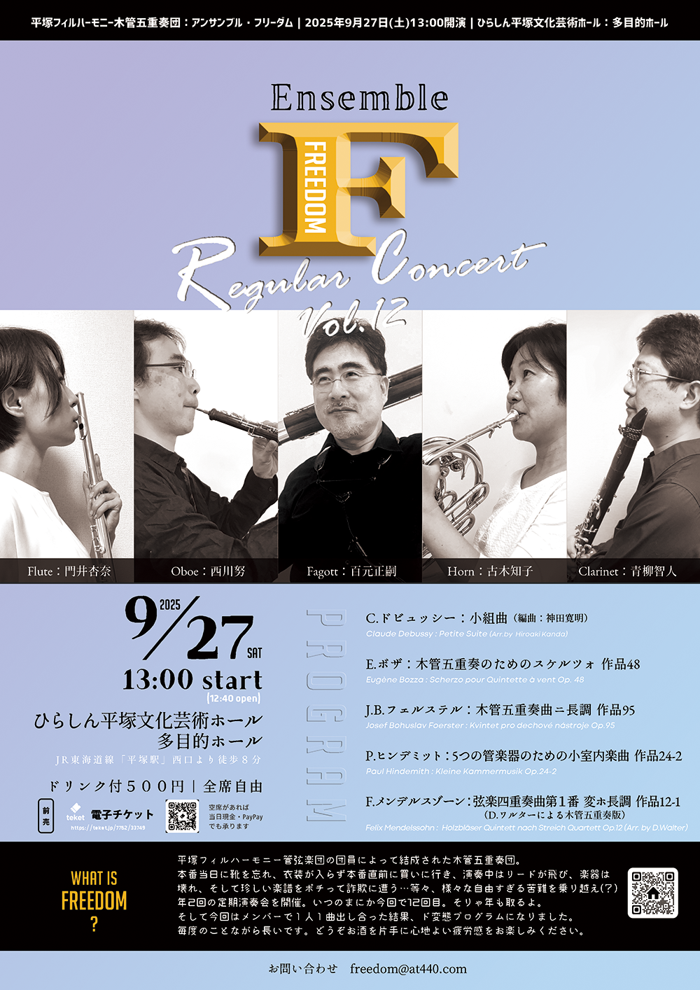 【ご案内】神奈川県平塚市で主に活動しているアマチュアオーケストラ団体である平塚フィルハーモニー管弦楽団の管楽器メンバーによる、木管五重奏の定期演奏会です。今回は所属オケの地元である神奈川県平塚市での開催です!
