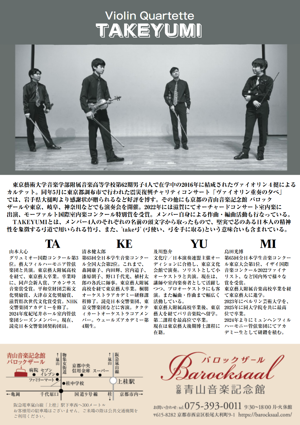 「TAKEYUMI」は2016年に結成され、今年9年目を迎える。東京芸大附属高校62期ヴァイオリン専攻の男子4人で活動をしている。これまでに東京・埼玉・神奈川・京都・岐阜・滋賀などで演奏を行ってきた。モーツァルト国際室内楽コンクールで特別賞を受賞している。