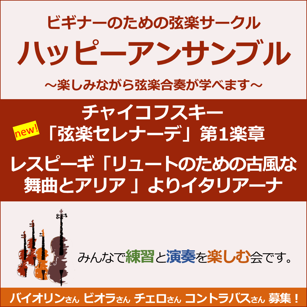 【大阪】弦楽サークル「ハッピーアンサンブル」★チャイコフスキー「弦楽セレナーデ」より第1楽章 とレスピーギの「イタリアーナ」を練習します。