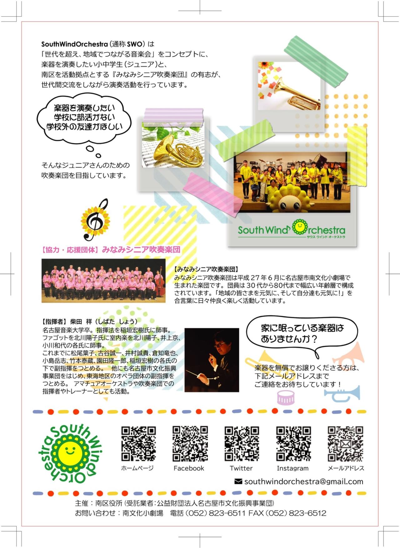 部活動の地域移行に伴い、楽器を演奏したい小中学生を対象として設立吹奏楽団です。指揮・指導は吹奏楽のみならずオーケストラやオペラなど多方面で指導実績のある柴田祥先生で、楽器を楽しく演奏することを目的としています。各楽器毎にもプロの講師をお願いしており、本格的な指導を受けることができます。演奏や活動のサポートは同じく名古屋市南区を活動拠点とするみなみシニア吹奏楽団の有志が行います。部活動との両立も可能です。一部ですが楽器のレンタルも可能です。楽器を吹きたい小中学生の皆さんをお待ちしています。ご興味を持たれた方はぜひお問い合わせください。