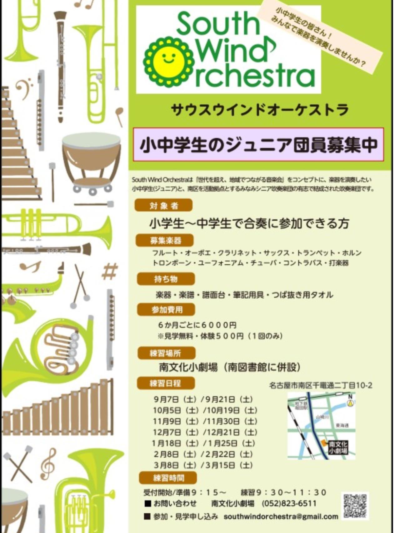部活動の地域移行に伴い、楽器を演奏したい小中学生を対象として設立吹奏楽団です。指揮・指導は吹奏楽のみならずオーケストラやオペラなど多方面で指導実績のある柴田祥先生で、楽器を楽しく演奏することを目的としています。各楽器毎にもプロの講師をお願いしており、本格的な指導を受けることができます。演奏や活動のサポートは同じく名古屋市南区を活動拠点とするみなみシニア吹奏楽団の有志が行います。部活動との両立も可能です。一部ですが楽器のレンタルも可能です。楽器を吹きたい小中学生の皆さんをお待ちしています。ご興味を持たれた方はぜひお問い合わせください。